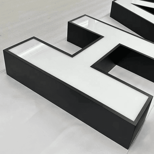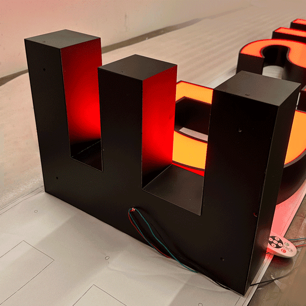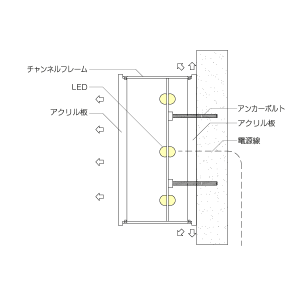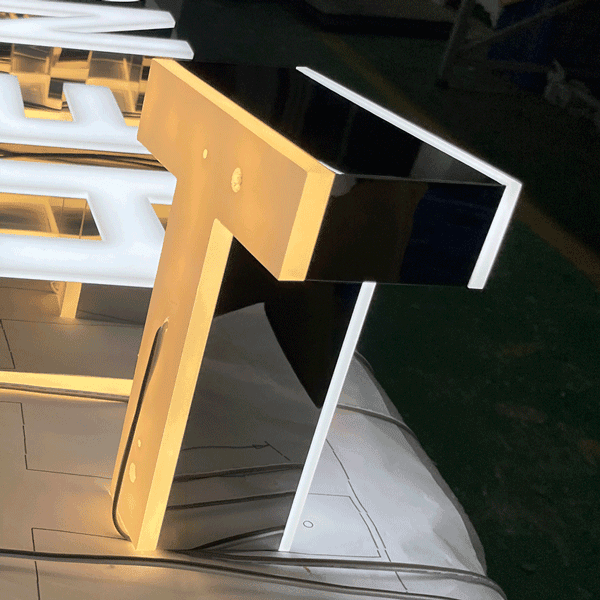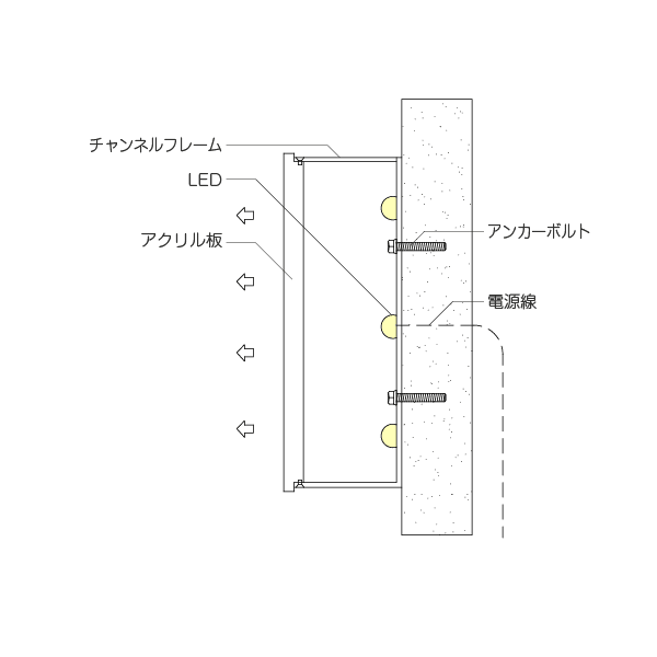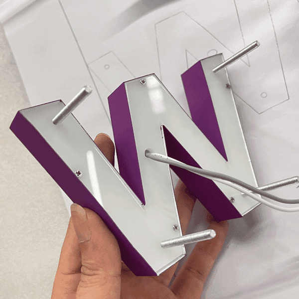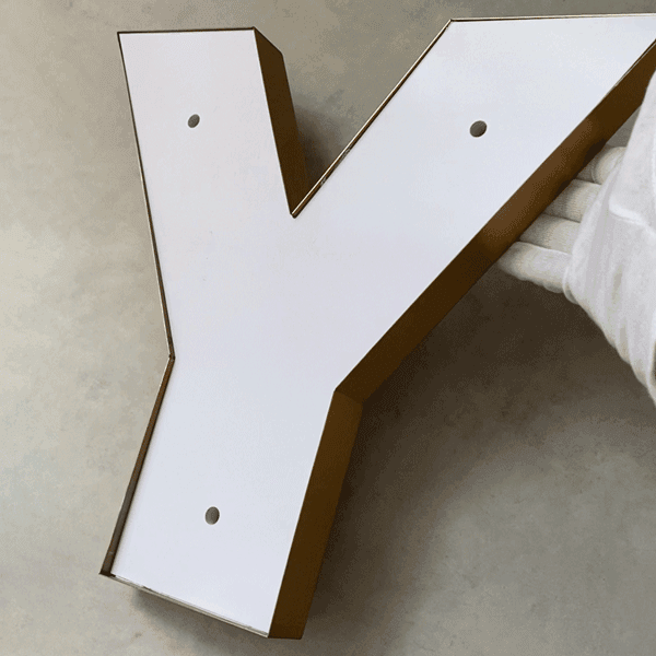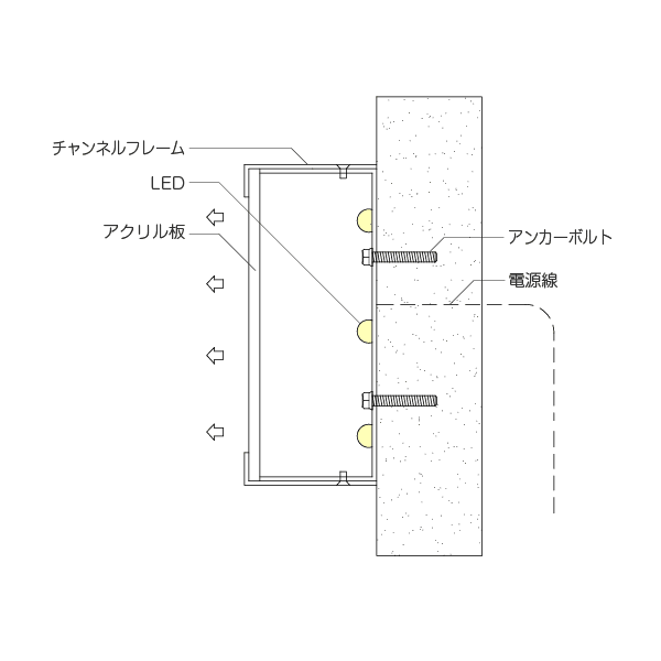 正面アクリル部分が発光するため視認性が高く、夜間でも文字の形をはっきりと表現できます。アクリルの表面に電飾用シートを貼ることで、好みの色に発光させることが可能です。従来式、LEDチャンネル文字のスタンダード型。中型・大型のサインにも対応可能です。