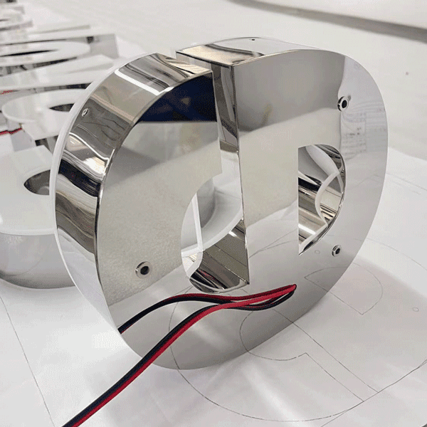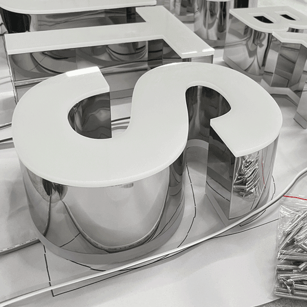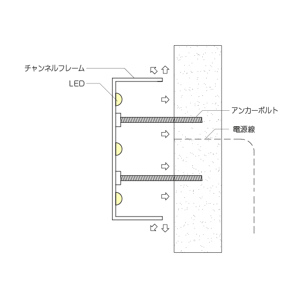 最もベーシックな金属チャンネルです。厚みを持たせ、立体的にすることで、平面的な看板に比べて高級感が感じられます。文字幅の細いデザインにも対応することができます。
